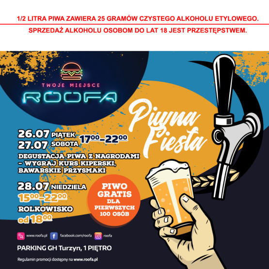 Codziennie 100 gratisów! – piwa, kiełbaski, hot-dogi, burgery. Szczegóły i regulamin promocji na www.roofa.pl