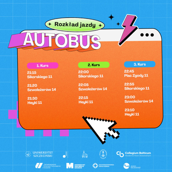 Imprezowe autobusy zatrzymają się na przystankach autobusowych: Sikorskiego – przystanek w stronę placu Kościuszki, Szwoleżerów – przystanek w stronę centrum, plac Zgody – przystanek na Wojska Polskiego w stronę Szwoleżerów. Pierwszy kurs odjedzie z przystanku Sikorskiego o 21:15, drugi o 22:00, a trzeci ruszy z pl. Zgody o 22:45.