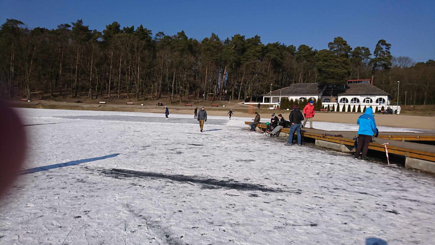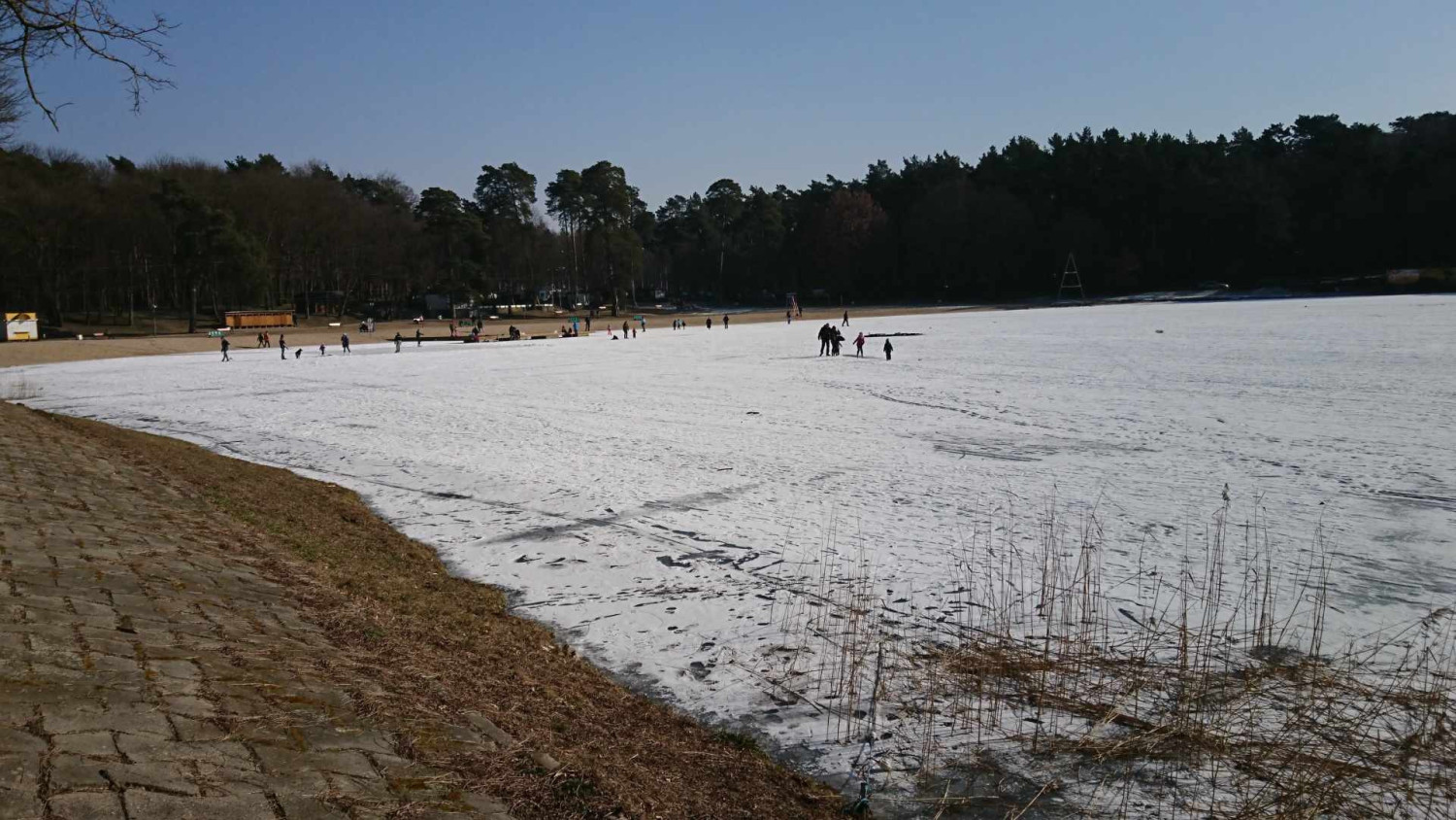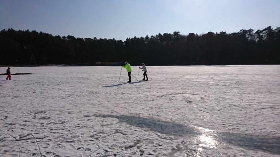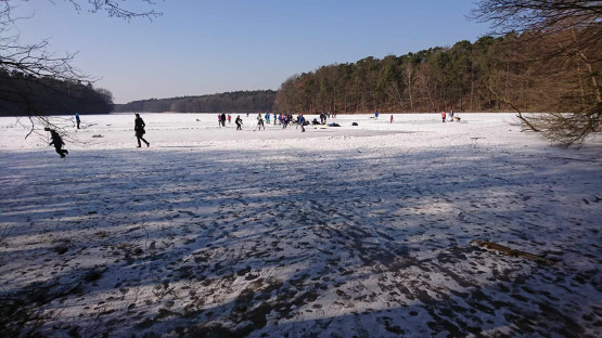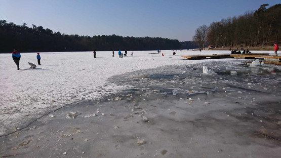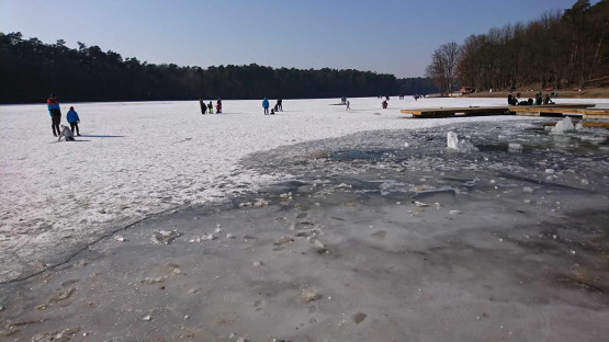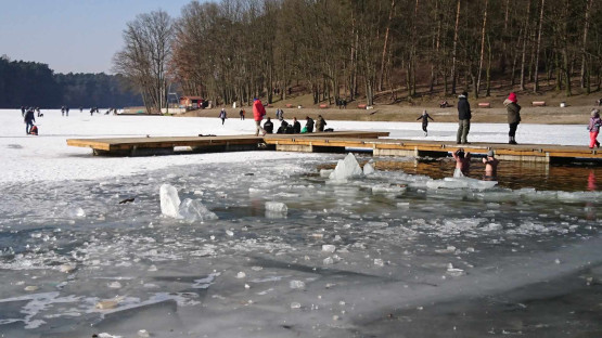 Na zdjęciach z 2018 roku widać ludzi jeżdżących na łyżwach oraz morsujących w rozkutych fragmentach tafli. Należy pamiętać, że wchodzenie na lód w każdych warunkach jest potencjalnym zagrożeniem i nawet bezpiecznie wyglądająca tafla może załamać się pod ciężarem ludzi, stąd apel, by nigdy tego nie robić.