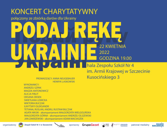 Również w piątek w hali Zespołu Szkół nr 4 przy ul. Kusocińskiego 3 odbędzie się koncert charytatywny „Podaj rękę Ukrainie” połączony ze zbiórką darów. Wystąpią m.in.: Andrzej Szpak, Magda Antonowicz, Alicja Firlit, Jan Zakrzewski, Swietłana Lewicka, Oksana Oksen. Początek o 19:00. Wstęp wolny. Szczegóły: https://www.facebook.com/events/678818299901289/