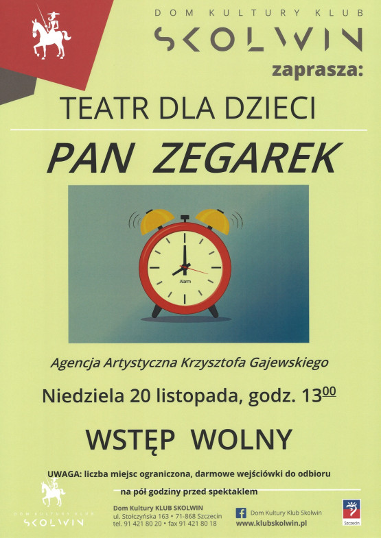 Dom Kultury Klub Skolwin w niedzielę, 20 listopada, zaprasza dzieci w wieku przedszkolnym i wczesnoszkolnym na spektakl pt. „Pan Zegarek”. Przedstawienie zostanie wystawione w siedzibie domu kultury przy ul. Stołczyńskiej 163 o godz. 13:00. Wstęp bezpłatny.