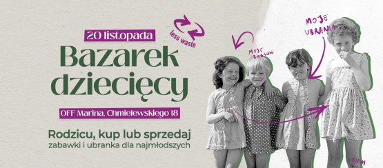 W tę niedzielę podczas Szczecińskiego Bazaru Smakoszy (w OFF Marinie przy ul. Chmielewskiego 18) odbędzie się też Bazarek Dziecięcy, podczas którego rodzice będą mogli sprzedawać, kupować i wymieniać dziecięce ubranka, książki i zabawki. Na dzieci czekać będą dodatkowe atrakcje, jak kreatywne warsztaty z Kasią Huzar-Czub i Bartkiem Orłowskim. Wydarzenie w godz. 10:00-15:00. Dla osób wystawiających wstęp 20 zł, dla odwiedzających wstęp jest bezpłatny. Szczegóły: https://www.facebook.com/events/713488273720366/