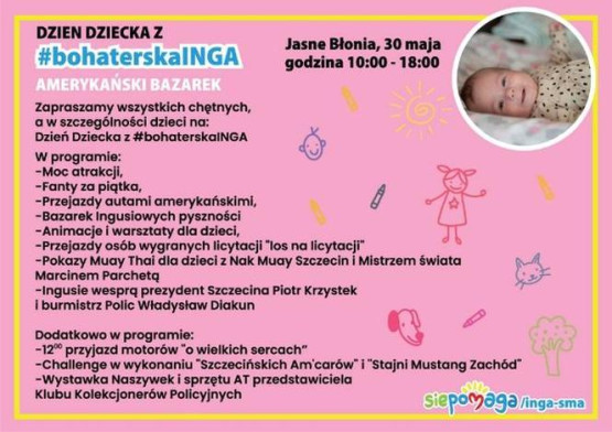 W tę niedzielę, 30 maja, na Jasnych Błoniach odbędzie się festyn, podczas którego zbierane będą środki dla 9-miesięcznej Ingi z Przęsocina k. Polic walczącej z rdzeniowym zanikiem mięśni. Być mieć szansę na wyleczenie dziewczynka potrzebuje ponad 9 mln zł na terapię genową! Na odwiedzających w niedzielę Jasne Błonia będzie czekać masa atrakcji, w tym dmuchańce, gry i zabawy, balony, bazarek pyszności, przejażdżki amerykańskimi autami. Wydarzenie zaplanowano w godz. 10:00-18:00.