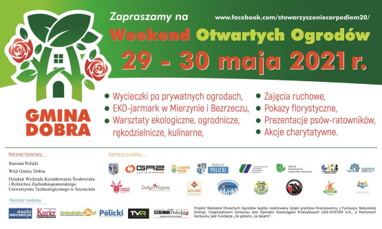 Bardzo ciekawe wydarzenie w najbliższy weekend, 29 – 30 maja, szykują nasi sąsiedzi z Gminy Dobra. To Weekend Otwartych Ogrodów, podczas którego będzie można zwiedzić najciekawsze prywatne ogrody mieszkańców Mierzyna, Dołuj, Wołczkowa, Dobrej, Buku, Stolca, Rzędzin. Poza podziwianiem ogrodów przygotowano masę innych atrakcji, jak pchle targi, kiermasze książek, warsztaty dla dzieci, wystawy plenerowe, jarmark, spacery z przewodnikami, pokazy florystyczne, zajęcia ruchowe. Szczegółowy program tutaj