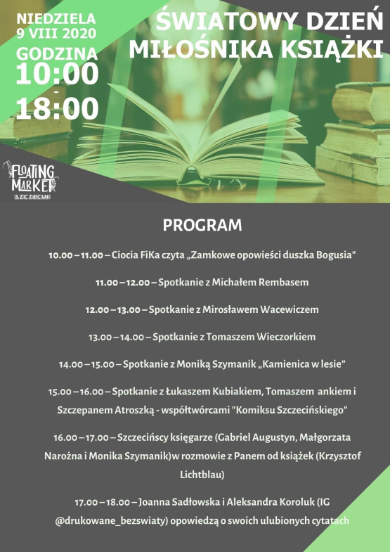 Z okazji Dnia Miłośników Książek w niedzielę, 9 sierpnia, w przepięknej scenerii nad Odrą odbędzie się wakacyjne spotkanie literackie. W godz. 10:00 – 18:00 na skwerze na końcu Łasztowni będzie można spotkać szczecińskich autorów z książkami oraz przedstawicieli kameralnej księgarni "FiKa", kawiarni z książkami "Kamienica w lesie" oraz Wydawnictwa Granda. Zaplanowano rozmowy o książkach,a także kiermasz książek za złotówkę. Wstęp wolny. Szczegóły: https://www.facebook.com/events/771577506922324/