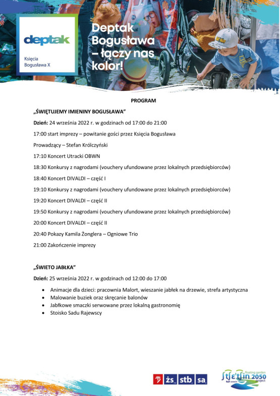 Po imieninach, w niedzielę, 25 września, na deptaku Bogusława odbędzie się „Święto jabłka”. W planie są animacje dla dzieci, wieszanie jabłek na drzewie, strefa artystyczna. Maluchy będą mogły za darmo pomalować sobie buzie oraz otrzymać skręcone w różne wzory balony. Lokalni gastronomicy serwować będą jabłkowe smakołyki. W niedzielę impreza potrwa w godzinach 12-17. Wstęp wolny.