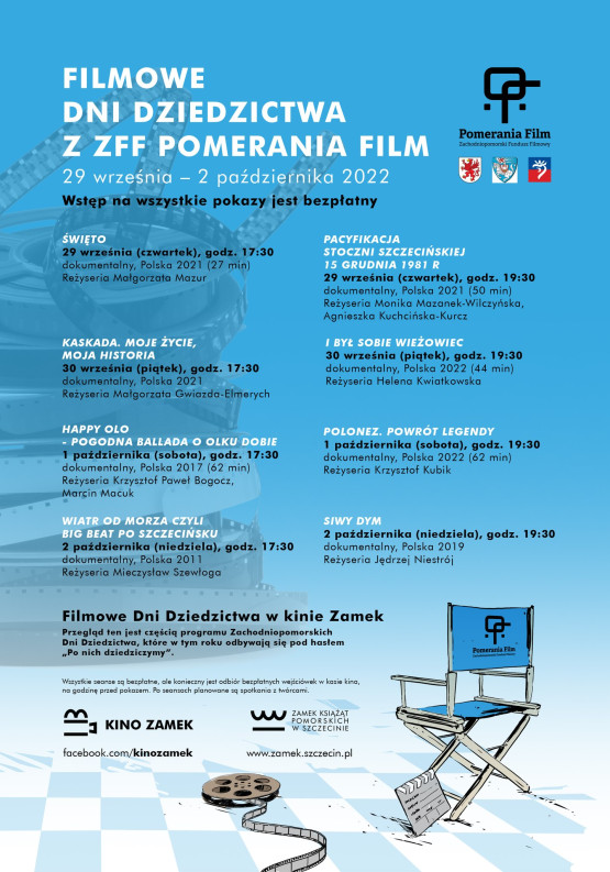 Zamek Książąt Pomorskich w Szczecinie w ten weekend zaprasza na „Filmowe Dni Dziedzictwa z ZFF Pomerania Film”. Do niedzieli włącznie w Kinie Zamek zaprezentowanych zostanie aż osiem bezpłatnych seansów, a wśród nich m.in. pogodna ballada o podróżniku Aleksandrze Dobie czy dokumenty o historii szczecińskiej Kaskady i wieżowcu TVP. Po seansach planowane są spotkania z twórcami filmów. Wstęp bezpłatny.