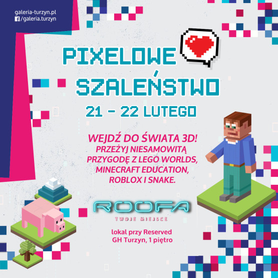 PixeLOVE szaleństwo w Galerii Handlowej Turzyn odbędzie się w piątek i sobotę, 21 i 22 lutego, w godz. 10:00-20:00. Wydarzenie będzie miało miejsce w przestrzeni Roofa na pierwszym piętrze galerii (w pobliżu salonu Reserved). Wstęp jest bezpłatny!