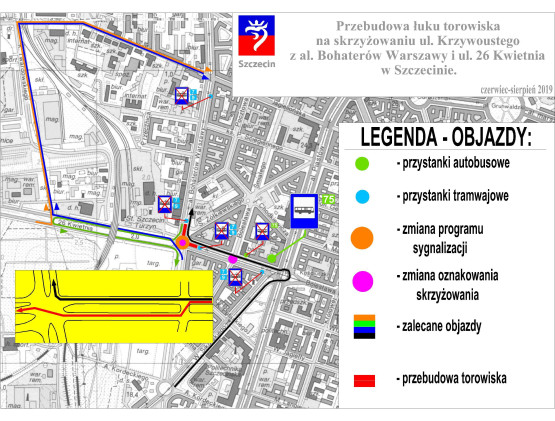 Utrzymany zostanie przejazd pojazdów zmierzających na relacji prawoskrętnej Krzywoustego - Bohaterów Warszawy.