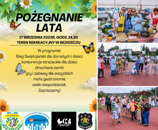 Biegi, konkurencje strażackie dla dzieci, dmuchane zamki, gry i zabawy, animacje, ognisko z kiełbaskami – to tylko część atrakcji, które szykowane są z okazji festynu rodzinnego „Pożegnanie lata”. Wydarzenie w niedzielę od godz. 14:30 na terenie sportowo-rekreacyjnym w Bezrzeczu. Wstęp wolny. Więcej: https://www.facebook.com/photo?fbid=718240053634366&set=a.474211058037268