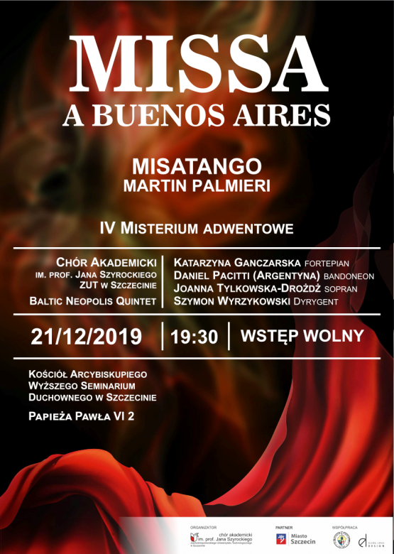 IV Misterium Adwentowe będzie niewątpliwie muzycznym prezentem dla wszystkich miłośników muzyki latynoamerykańskiej. „Missa a Buenos Aires”, znana również jako „Misatango”, to kompozycja argentyńskiego kompozytora Martína Palmeri w stylu Tango Nuevo. Argentyński bandoneonista Daniel Pacitti, sopranistka dr hab. Joanna Tylkowska-Drożdż, prof. AS, Baltic Neopolis Quintet, pianistka Katarzyna Ganczarska oraz Chór Akademicki im. prof. Jana Szyrockiego ZUT, wykonają to spektakularne dzieło, oparte na ognistych rytmach argentyńskiego tanga pod kierownictwem dr. hab. Szymona Wyrzykowskiego. Utwór zabrzmi w Kościele Arcybiskupiego Wyższego Seminarium Duchownego w Szczecinie (ul. Papieża Pawła VI 2) w najbliższą sobotę, 21 grudnia, o godz. 19.30. Wstęp jest wolny.