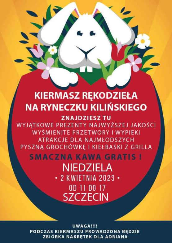 W niedzielę odbędzie się pierwszy wielkanocny kiermasz rękodzieła na rynku Kilińskiego w Szczecinie. Ma być dużo twórców rękodzieła, muzyka, jedzenie, grochówka, kiełbaski z grilla i zabawy dla dzieci. Wydarzenie w godz. 11:00-17:00. Wstęp wolny. Szczegóły: https://www.facebook.com/events/989157049136782