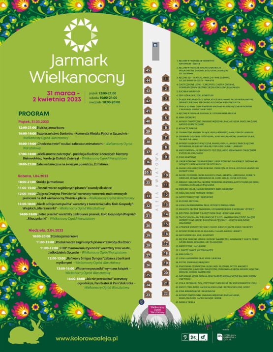 Od piątku do niedzieli w alei kwiatowej będzie odbywać się Szczeciński Jarmark Wielkanocny. Na kilkudziesięciu stoiskach będzie można kupić m.in. wielkanocne ozdoby, pisanki, wianki i koszyczki, tradycyjne wędliny, sery, pieczywo, miody, rękodzieło i wyroby drewniane. Jarmark rozpocznie się w piątek o 12:00. Tego dnia po południu zaplanowano m.in. warsztaty dla dzieci, na których poznają gry i zabawy podwórkowe. W sobotę i niedzielę odbędą się m.in. warsztaty z ozdabiania pisanek i tworzenia palemek. Dzieci będą mogły wcielić się też w poszukiwaczy zaginionych pisanek i stworzyć zajęczą Drużynę Pierścienia. Udział bezpłatny. Szczegóły tutaj