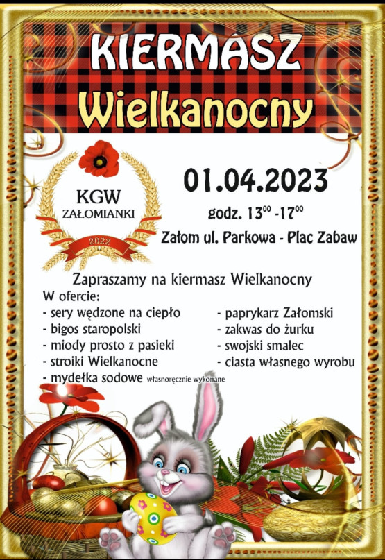 Koło Gospodyń Wiejskich Załomianki w sobotę zaprasza na kiermasz wielkanocny. W ofercie będą m.in. sery wędzone na ciepło, bigos staropolski, miody prosto z pasieki, swojski smalec czy ciasta własnego wypieku. Wydarzenie w godz. 13:00-17:00 na placu zabaw przy ul. Parkowej w Załomiu.