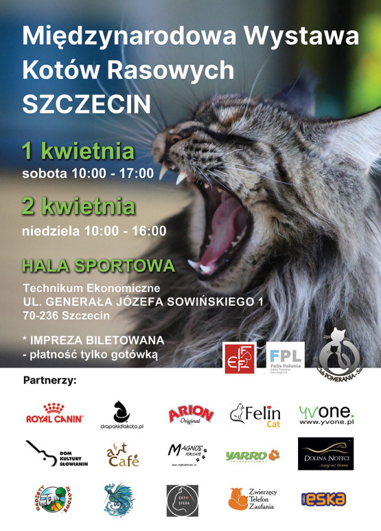 W sobotę i niedzielę w hali sportowej przy ul. Sowińskiego 1 odbędzie się Międzynarodowa Wystawa Kotów Rasowych. Organizatorzy spodziewają się około 150-200 kotów różnych ras. Będą m.in. niebieskookie koty rasy ragdolli, bezwłose sfinksy, smukłe koty orientalne, cętkowane bengale czy dostojne koty brytyjskie. W sobotę wystawa dla zwiedzających będzie otwarta w godz. 10:00-17:00, a w niedzielę w godz. 10:00-16:00. Bilety 20 i 30 zł. Szczegóły: http://www.catclubszczecin.pl/?miedzynarodowa-wystawa-kotow-rasowych-szczecin-informacja-dla-zwiedzajacych