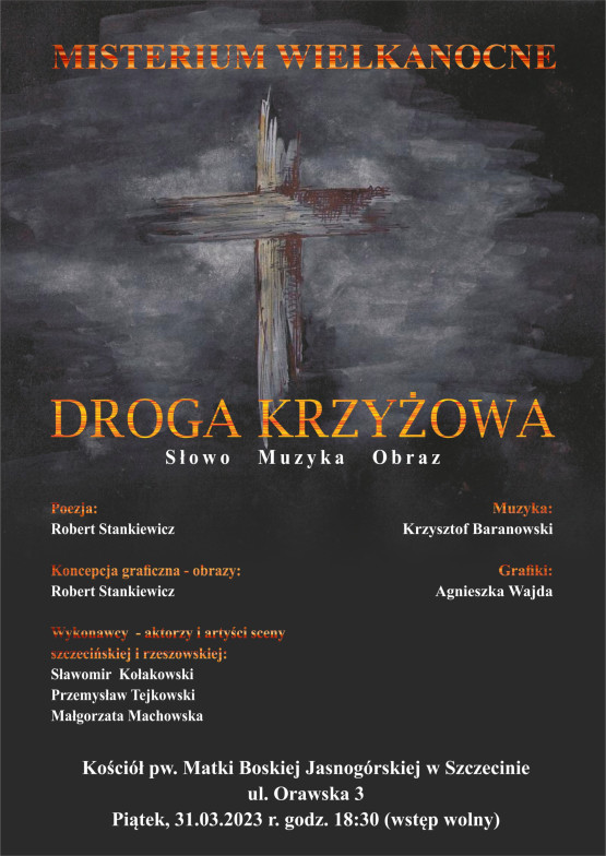 Misterium Wielkanocne w formie spektaklu audiowizualnego w wykonaniu artystów scen szczecińskiej i rzeszowskiej. Początek o godz. 18:30 w kościele pw. Matki Bożej Jasnogórskiej przy ul. Orawskiej 3. Wstęp wolny.