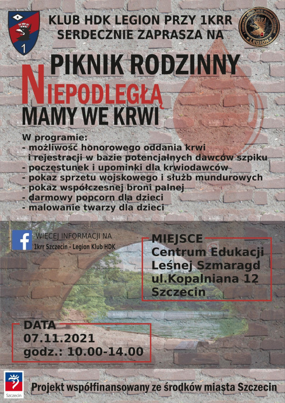 Rodzinny piknik pod nazwą „Niepodległą mamy we krwi” odbędzie się w niedzielę, 7 listopada, w godzinach 10:00–14:00 na terenie Centrum Edukacji Leśnej Szmaragdowe w Szczecin przy ul. Kopalnianej 12. W czasie trwania imprezy przewidziane są różnego rodzaju darmowe atrakcje dla dzieci, pokaz sprzętu służb mundurowych oraz szkolenie z pierwszej pomocy przedmedycznej. Dodatkowo rozdawane będą materiały promujące honorowe krwiodawstwo, a także zapewnione zostaną gorące i zimne napoje. Na dzieci czeka również darmowy popcorn oraz możliwość pomalowania sobie twarzy. Dla każdego krwiodawcy, który odda krew, przewidziane są upominki, drobny poczęstunek oraz gadżety. Wstęp wolny. Szczegóły: https://www.facebook.com/events/939106710288945/