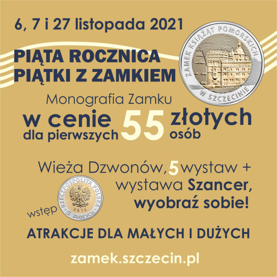 W listopadzie mija 5 lat od wydania okazjonalnej monety (o nominale 5 zł) przedstawiającej Zamek Książąt Pomorskich w Szczecinie. Z tej okazji szczeciński Zamek przygotował szereg niespodzianek dla odwiedzających. W sobotę i niedzielę, 6 i 7 listopada, mieszkańcy będą mogli zwiedzić Wieżę Dzwonów (wyjątkowo otwartą na tę okazję) oraz wystawy (w tym najnowszą „Szancer, wyobraź sobie!”) w ramach jednego biletu za 5 złotych! Dodatkowo pierwsze 55 osób będzie mogło nabyć monografię „Karty z dziejów zamku książęcego w Szczecinie” w specjalnej cenie 55 złotych. Do zakupu dołączona zostanie torba z zamkowymi publikacjami. Dla osób, które zrobią zakupy za minimum 105 złotych czekać będzie wyjątkowa niespodzianka. Szczegóły: https://www.facebook.com/zamek.szczecin/photos/a.10150258770700158/10166005173400158/