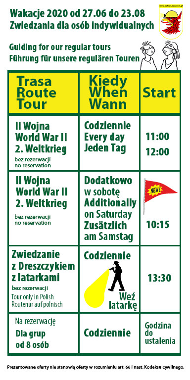 * Zwiedzania codziennie o 11:00, 12:00 i 13:30 (bez rezerwacji, start nawet od 1 osoby), ale można dokonać też rezerwacji na inną godzinę niż 12:00, prosimy o tel. albo e-mail. Dopiero potwierdzona rezerwacja jest gwarancją odbycia się wycieczki. W soboty wprowadzono dodatkowe zwiedzanie o godz. 10:15.