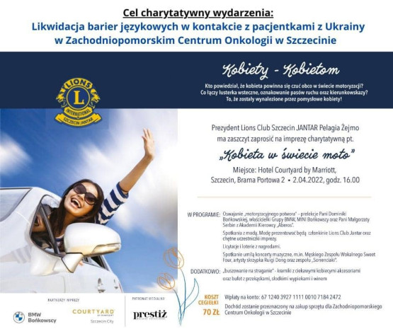Stowarzyszenie Lions Club Szczecin Jantar w sobotę, 2 kwietnia, zaprasza na imprezę charytatywną z okazji Dnia Kobiet, z której dochód przeznaczony zostanie na rzecz kobiet – w tym roku będzie to zakup sprzętu medycznego dla Zachodniopomorskiego Centrum Onkologii w Szczecinie. Impreza ma charakter otwarty i bogaty program artystyczny. Motyw przewodni to „Kobieta w świecie moto”. Podczas imprezy zostanie zaprezentowana kolekcja mody firm Patrizia Aryton oraz Portfolio. Świat motoryzacji przybliżą wystąpienia Dominiki Bońkowskiej – właścicielki Grupy BMW/Mini Bońkowscy oraz Magłorzaty Serbin – intuktorki techniki jazdy w Akademii Kierwocy „Aberos”. Oprawę muzyczną zapewnią m.in. Męski Zespół Wokalny Sweet Four oraz artysta skrzypek Ruigi Dong. Na zakończenie przewidziany jest poczęstunek przy winie. Początek o 16:00. Wstęp kosztuje 70 zł.