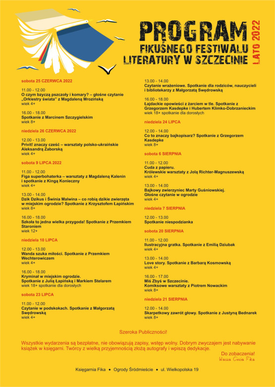 Szczecińska księgarnia autorska FiKa, która od niedawna ma nową siedzibę w Ogrodach Śródmieście przy ul. Wielkopolskiej 19, tego lata organizuje w naszym mieście Fikuśny Festiwal Literatury. Zaplanowane wydarzenia rozłożono na kilka weekendów. Najbliższe spotkania odbędą się właśnie 23 i 24 lipca. W ten weekend mali i duzi czytelnicy będą mieli okazję spotkać się z Grzegorzem Kasdepke, Hubertem Klimko-Dobrzanieckim oraz Małgorzatą Swędrowską. Wstęp jest bezpłatny.