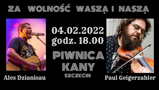 W Piwnicy Kany w piątek, 4 lutego, odbędzie się wydarzenie „Za Wolność Waszą i Naszą”, czyli międzynarodowa pomoc dla białoruskich przyjaciół w ciężkiej sytuacji. Wystąpią: Aleś Dzianisau oraz Paul Geigerzhle. Wydarzenie biletowane. Całość dochodu przeznaczona będzie dla muzyków. Bilety: 20 i 30 zł. Początek o 18:00. Szczegóły: https://www.facebook.com/events/204794865199090/