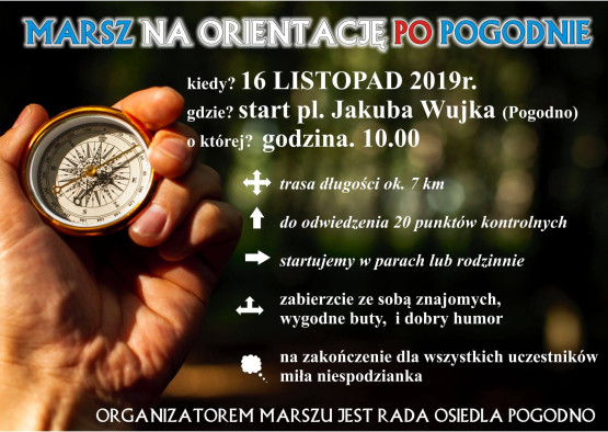 Rada Osiedla Pogodno w sobotę, 16 listopada, zaprasza na Marsz na orientację po Pogodnie. Trasa będzie liczyła 7 km i znajdzie się na niej 20 punktów kontrolnych. Można startować w parach lub rodzinnie. Zbiórka o godz. 10:00 na pl. Jakuba Wujka. Na zakończenie na uczestników będzie czekała miła niespodzianka. Udział bezpłatny.
