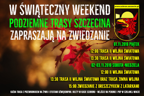Weekend to idealna okazja, aby zwiedzić wielkie podziemia pod dworcem PKP w Szczecinie, zbudowane przez Niemców podczas II wojny światowej, przy wykorzystaniu podziemi XVIII-wiecznych fortyfikacji. Podziemne Trasy Szczecina zapraszają na specjalne wycieczki z przewodnikiem. 1 listopada oraz w sobotę i niedzielę, 2 i 3 listopada, o godz. 12:00 oraz 13:30 możliwe jest zwiedzanie schronu trasą "II Wojna Światowa". Uczestnicy przenoszą się w czasy alianckich bombardowań i odkrywają legendę niekończących się tuneli podziemnego miasta. Podczas zwiedzania opowieści przewodnika towarzyszą różne efekty dźwiękowe. Dodatkowo w sobotę i niedzielę odbywają się też wycieczki trasą „Zimna Wojna” oraz spacery z dreszczykiem. Zwiedzanie trasą „Zimna Wojna” odbywa się w sobotę i niedzielę o godz. 13:30. Uczestnicy mają okazję przenieść w czasy PRL-u oraz zwiedzić m.in. centrum dowodzenia i ćwiczeń Obrony Cywilnej. Z kolei o godz. 15:00 ma miejsce zwiedzanie z dreszczykiem, czyli wycieczka po schronie wyłącznie w świetle latarek. To propozycja dla całych rodzin z dziećmi w wieku co najmniej 7 lat. Każde oprowadzanie trwa około godziny. Wcześniejsze rezerwacje nie są wymagane. Bilety normalne kosztują 25 zł, ulgowe 20 zł i rodzinne 60 zł (2 rodziców + 2 dzieci). Dzieci do 5 lat zwiedzają gratis. Szczegóły tutaj