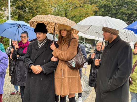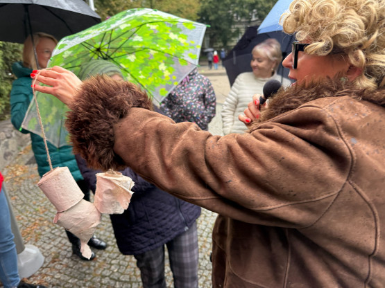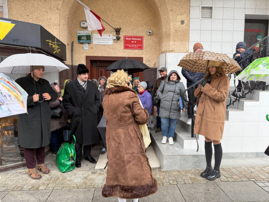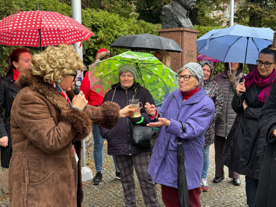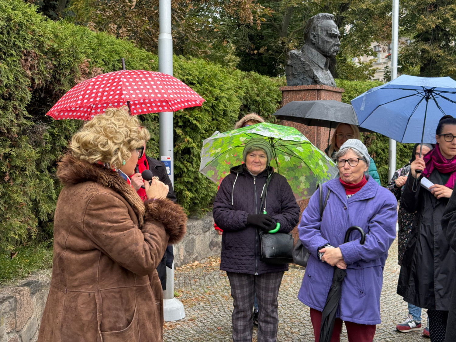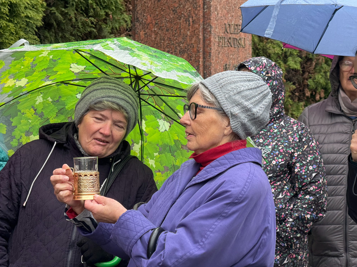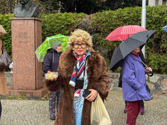 Spacer rozpoczynamy na placu Szarych Szeregów. Chętnych nie brakuje, a deszcz i silny wiatr nie są dla nich przeszkodą.