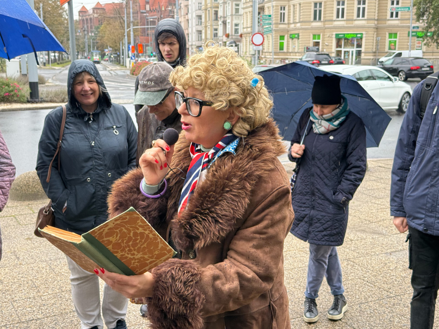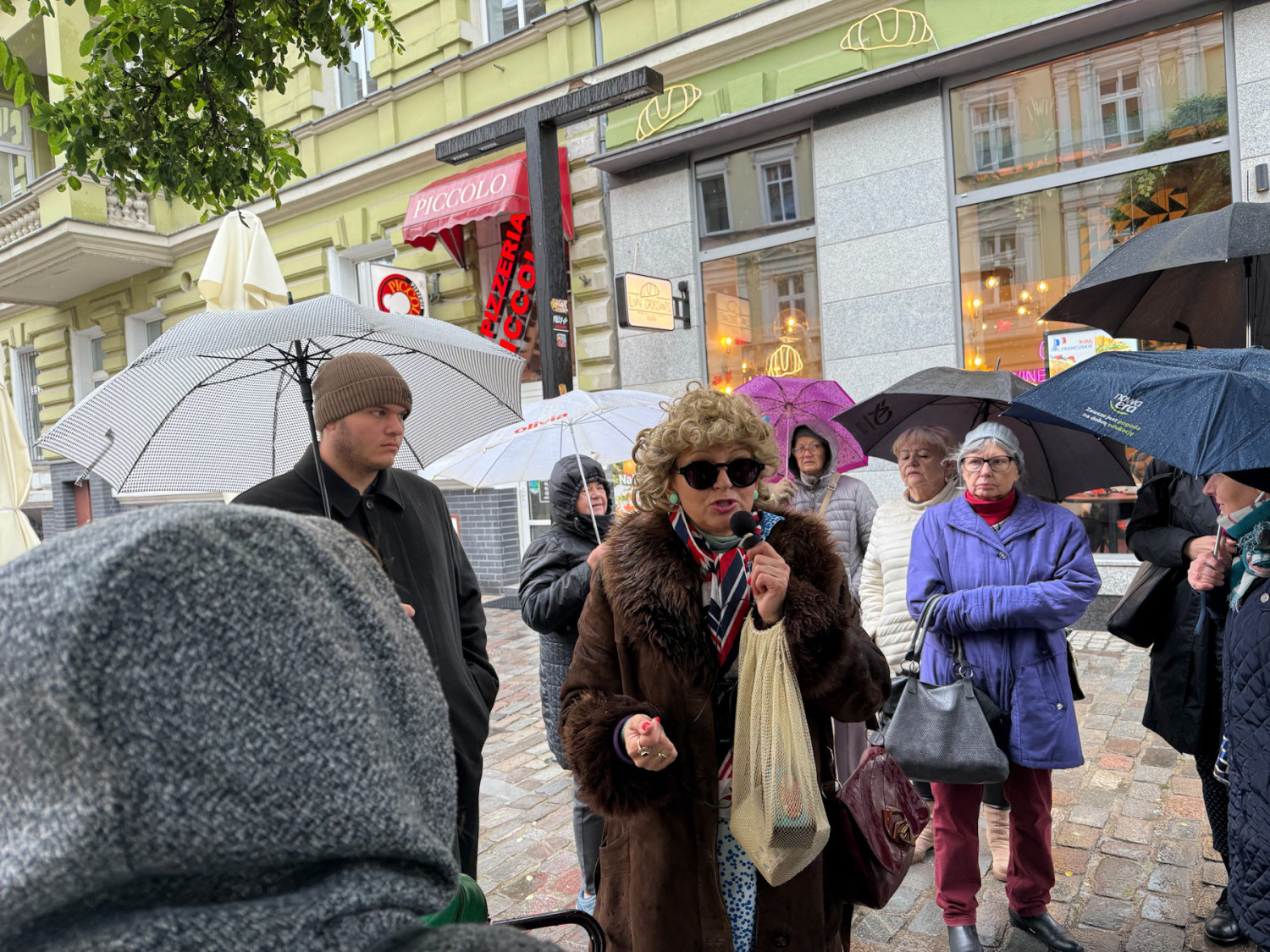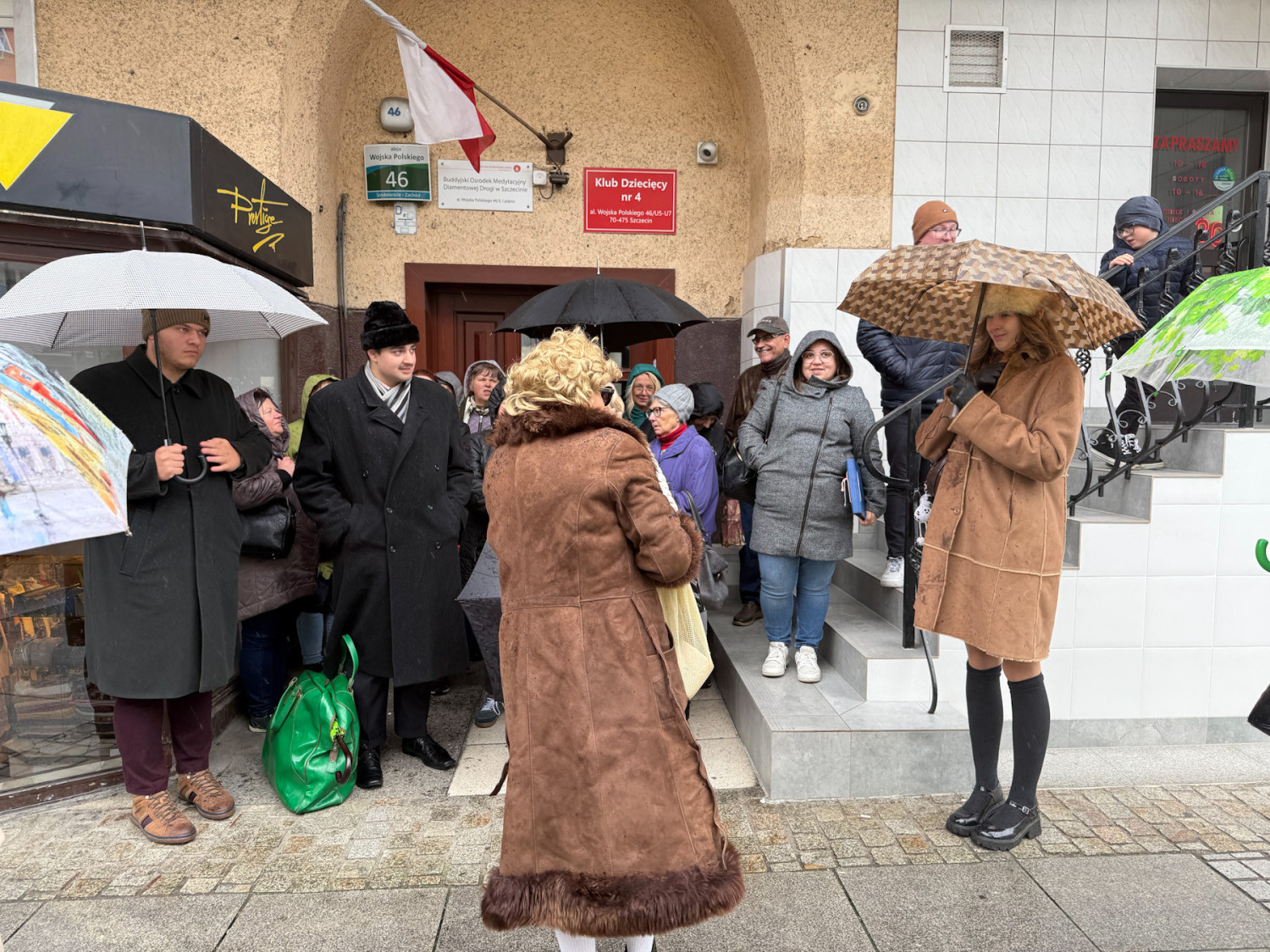 – Dzień dobry, już spieszę z landrynką. Proszę się częstować – wita wesoło Justyna Machnik, która częstuje uczestników twardymi cukierkami. Odziana w futro, z zielonymi klipsami i wałkami we włosach, założycielka Muzeum Szczecin w PRL jest naszą przewodniczką.