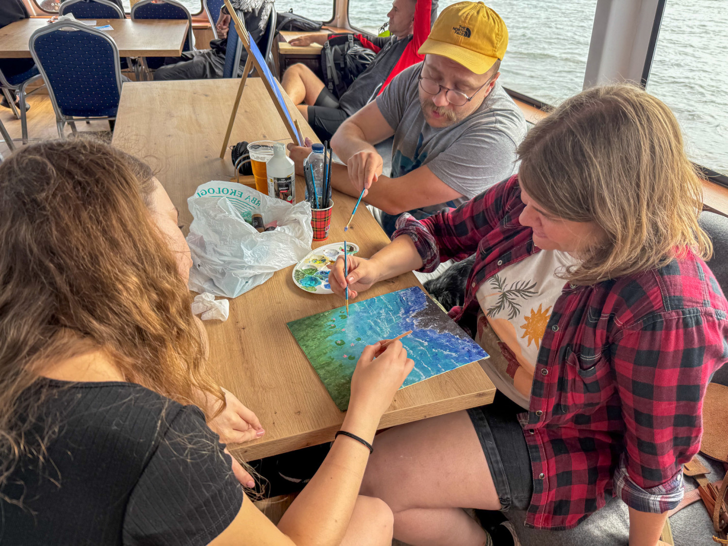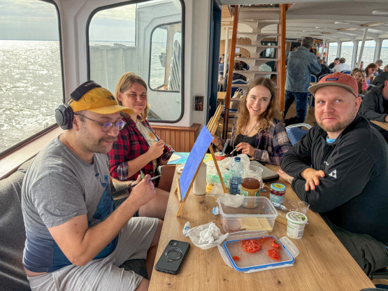 Dante przez chwilę podziwiał widoki, a potem zasnął przy stoliku pod pokładem. Anna i Dante na rejs wybrali się w towarzystwie znajomych. Grupka młodych ludzi zwracała na siebie uwagę nie tylko ze względu na psa, ale i zajęcie, któremu oddawali się przez cały rejs. To… malowanie obrazów. Przy stoliku Anna, Bartosz, Dawid i Zosia żywo rozmawiali i tworzyli wspólnie obrazy. - To mój sposób na relaks, a tu wiedziałem, że będziemy mieli cztery godziny rejsu, więc będzie dużo czasu, aby coś stworzyć. Co dokładnie powstanie? Jeszcze nie wiem - mówi jeden z mężczyzn.