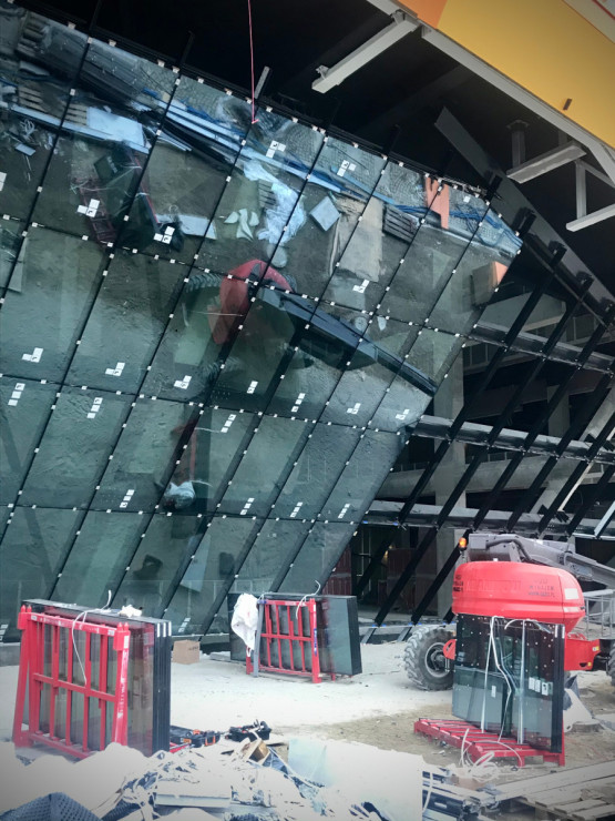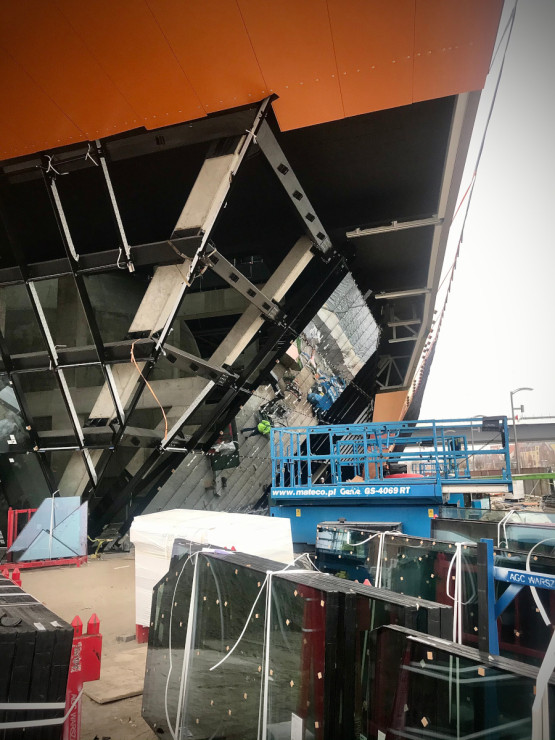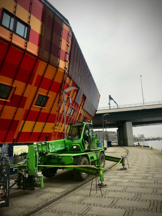 – Konstrukcja nowego rozwiązania opiera się na dwóch oddalonych od siebie warstwach elewacyjnych, wzajemnie uzupełniających odbiór przestrzenny – wyjaśnia. – Wewnętrzna płaszczyzna w postaci kolorowych paneli jest autorską interpretacją poprzesuwanych kontenerów morskich. Zewnętrzna, zbudowana z czarnej siatki cięto-ciągnionej, poprzez swoją perforację buduje wraz z naturalnym oświetleniem finalny przestrzenny efekt.