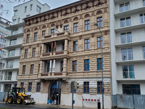 Trudno nie odnieść wrażenia, że kamienica została wyremontowana z dużą troską o detale. – Elewacja skrywa historię, w tym takie elementy jak kroksztyny czy maszkarony, a także inne elementy np. z gipsu. Upiększają one kamienicę i budują kontrast między XIX-wieczną zabudową a nową częścią – mówi Drobiazgiewicz. – Kolor elewacji wynika z odkrywek i jest nawiązaniem do polichromii i elementów stolarskich z wnętrza klatki schodowej – dodaje.