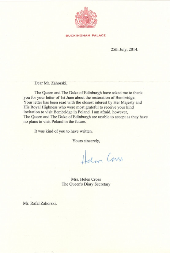 - Królowa i Książę Edynburga poprosili mnie, by podziękować Panu za list z dnia 01.07.2014 roku o restauracji statku Bembridge. Pański list został przeczytany z najwyższą uwagą przez Jej Wysokość i Jego Wysokość, którzy byli wielce wdzięczni za otrzymanie waszego zaproszenia, by odwiedzić Bembridge w Polsce. - napisał Osobisty Sekretarz Królowej w odpowiedzi na list Rafała Zahorskiego.