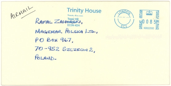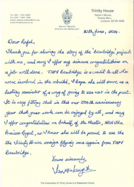 Na list o uratowaniu i odrestaurowaniu THPV Bembridge przez Polaków w Szczecinie odpowiedział też vice szef Trinity House, Kapitana Ian McNaught. - Chciałbym serdecznie pogratulować dobrze wykonanej pracy. THPV Bembridge jest uznaniem dla wszystkich, którzy byli zaangażowani w jej odbudowę. Mam nadzieję że będzie ona obecnie służyła jako trwała pamiątka podroży morskich z przeszłości. Co za zbieg okoliczności, że akurat na nasze 500-lecie Wasza praca może być podziwiana przez nas wszystkich. Chciałbym także przekazać gratulacje w imieniu Szefa (tł. Trinity House London) Jej Królewskiej Wysokości Księżnej Anny, jako że wiem, iż będzie ona dumna, widząc ponownie dumnie powiewającą flagę Trinity House nad THPV Bembridge. - napisał Ian McNaught.