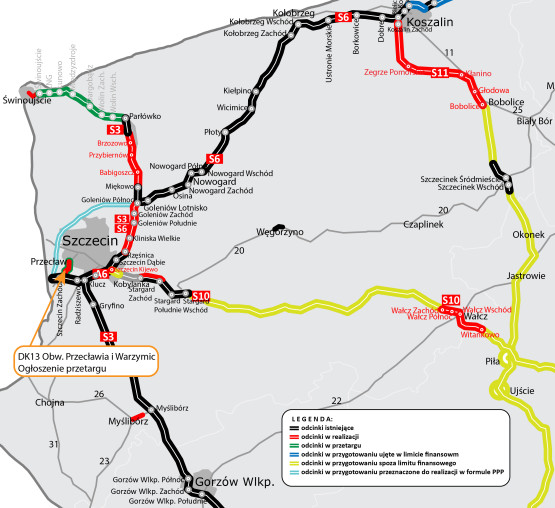 - Odcinek, dla którego został ogłoszony przetarg na realizację, będzie się rozpoczynał od ronda Hakena do przecięcia z obecną DK13 w rejonie skrzyżowania do miejscowości Siadło Górne. Na drodze powiatowej między Przecławiem a Ustowem powstanie węzeł drogowy Przecław. Droga na południe od miejscowości Przecław włączy się w obecny przebieg DK13. Ten fragment obwodnicy umożliwi wyprowadzenie ruchu tranzytowego z miejscowości Przecław i Warzymice, dzięki czemu skończą się zatory drogowe na obecnym przebiegu DK13. Będzie to dwujezdniowa droga klasy GP o dwóch pasach ruchu w każdą stronę – informuje Ewa Adamczewska ze szczecińskiego oddziału GDDKiA.