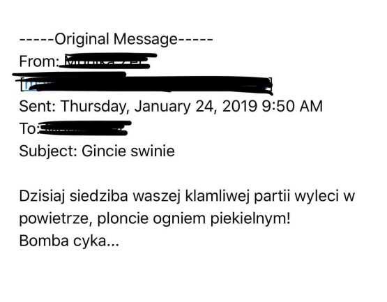 „Dzisiaj siedziba Waszej kłamliwej partii wyleci w powietrze, płońcie ogniem piekielnym. Bomba cyka” – wiadomość takiej treści trafiła między innymi do Szczecina.