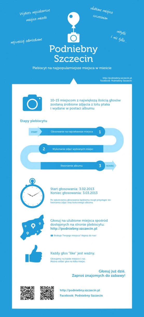 Na najpiękniejsze miejsca możemy oddawać głosy za pośrednictwem strony http://podniebny.szczecin.pl/ i profilu inicjatywy w portalu Facebook. Po zakończeniu głosowania pomysłodawcy wybiorą 10 - 15 miejsc z największą ilością głosów, które trafią do albumu.