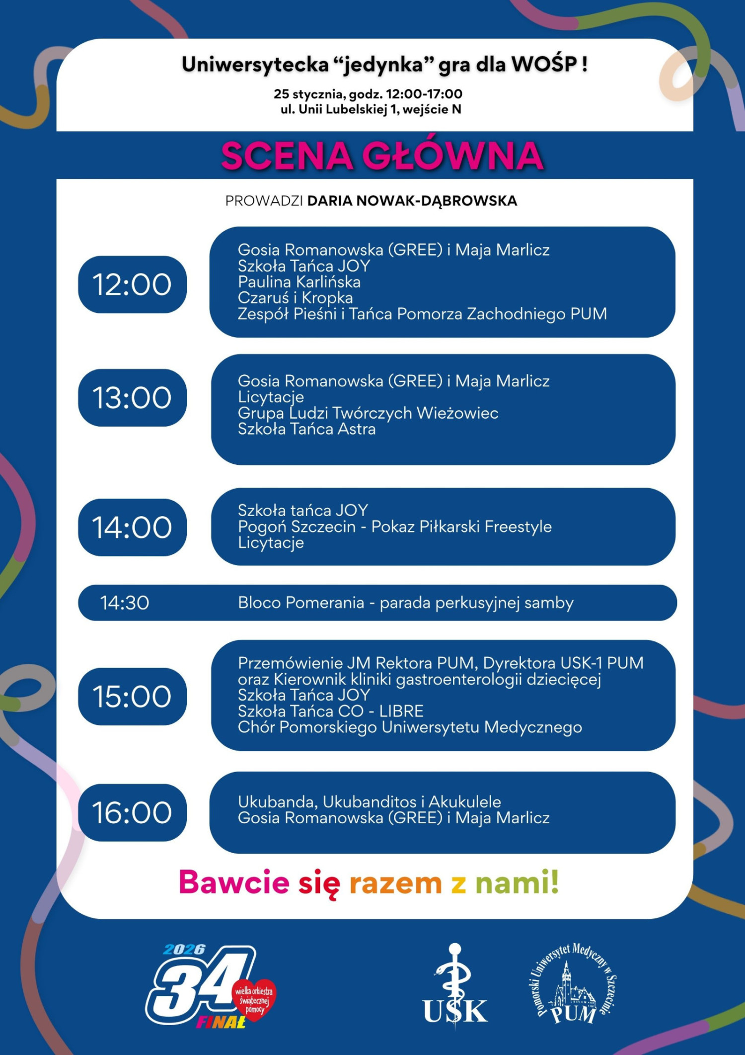 O muzyczną stronę zadbają Bloco Pomerania, Chór Pomorskiego Uniwersytetu Medycznego, Zespół Pieśni i Tańca Pomorza Zachodniego PUM, Maja Marlicz i Gosia Romanowska, Akukulele, Czaruś i Kropka, Grupa Ludzi Twórczych Wieżowiec.