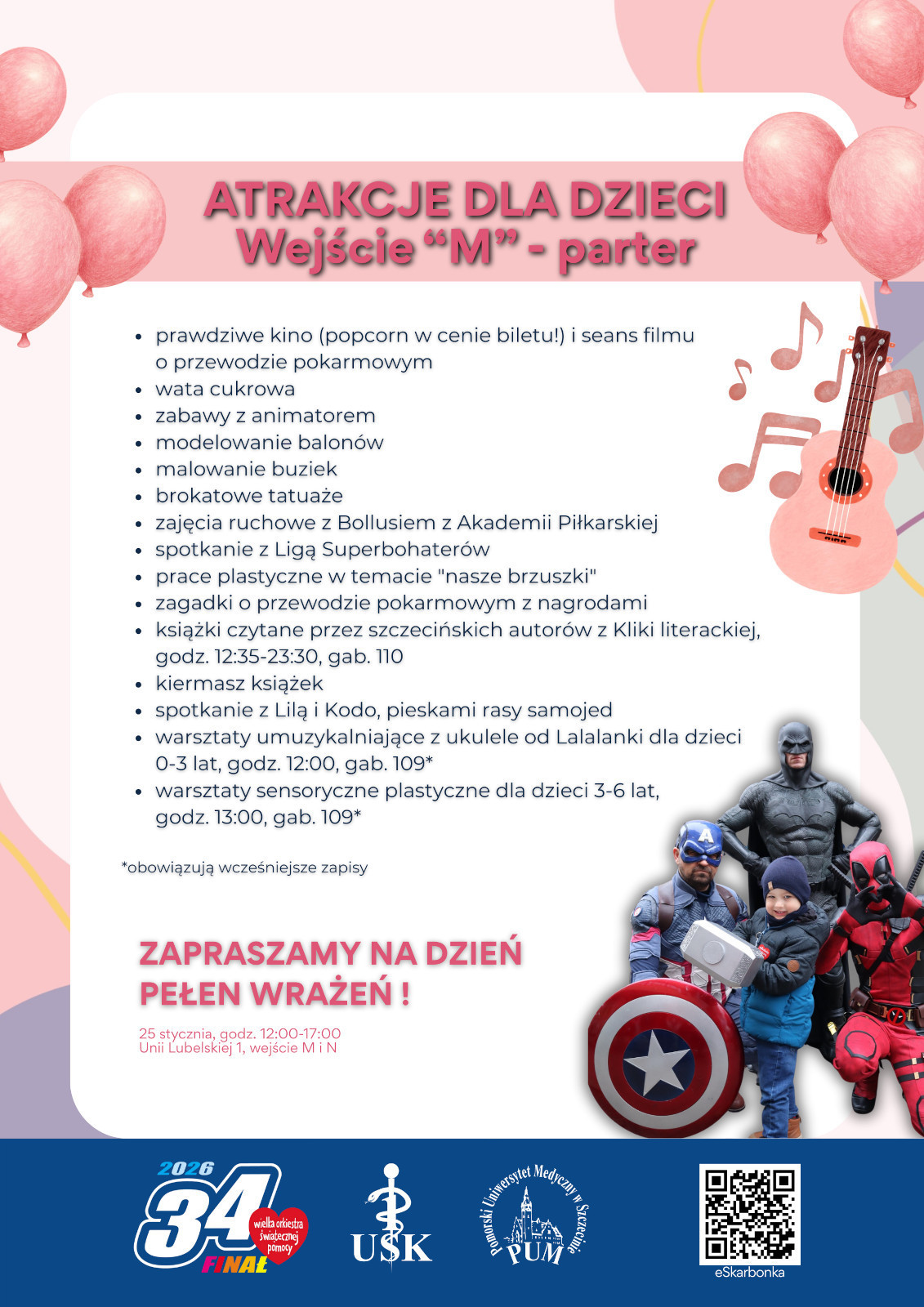 Nie zabraknie także atrakcji dla dzieci – Strefy „Małego sPortowca” (tor przeszkód, bramka celnościowa, strefa artystyczna, strefa zdjęć z gościem specjalnym – Gryfusem), spotkania z Ligą Superbohaterów, strażakami, policjantami i żołnierzami. W planie znalazły się również warsztaty taneczne i występy artystyczne, loterie fantowe, kiermasze i licytacje, fotobudka 360°, kawiarnia z aromatyczną kawą oraz wiele atrakcji dla najmłodszych, które jak podkreślają organizatorzy, „mają wartość większą niż same zabawki – budują odwagę, ciekawość i poczucie udziału w czymś naprawdę WILKIM”.