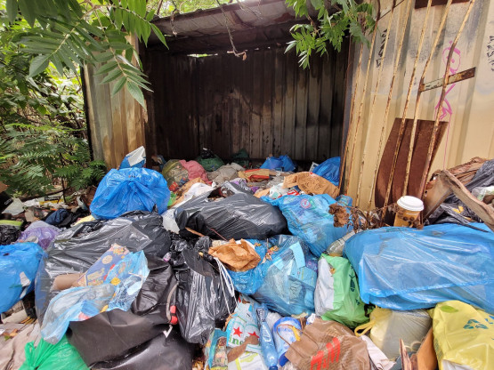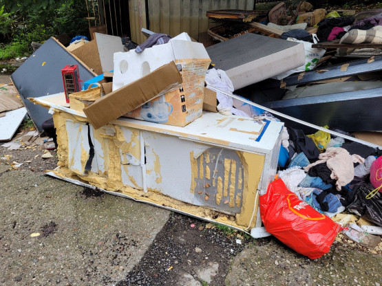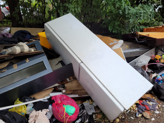 Na hałdzie widać lodówkę, wannę, fotel, drzwi, a nawet meblościankę. Wszystko to jest obłożone śmieciami komunalnymi.