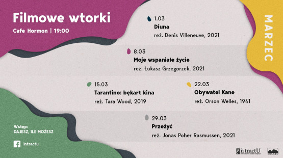 W marcu w ramach Filmowych Wtorków organizowanych przez Stowarzyszanie „in tractU” w Cafe Hormon na widzów czeka prawdziwa kinowa uczta. Znajdą dla siebie coś zarówno fani polskiego kina, jak i miłośnicy światowych klasyków. Filmowe Wtorki rozpoczynają się o godz. 19:00.