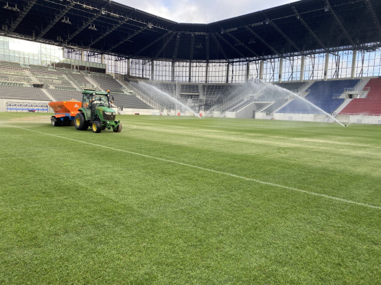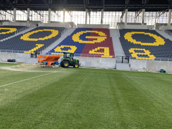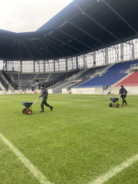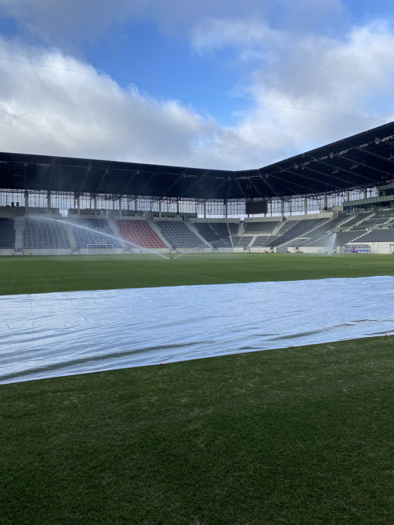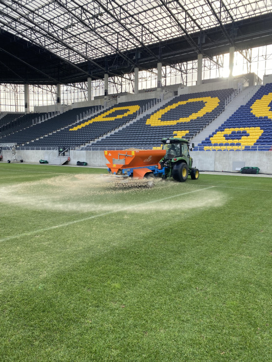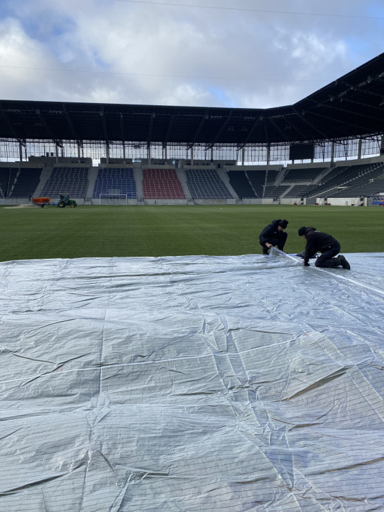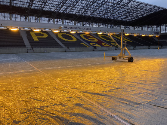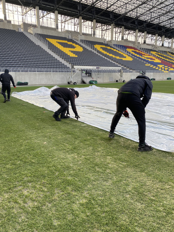 – Uruchomiliśmy system podgrzewania murawy i przez kilka dni podnosiliśmy stopniowo jej parametry, aby uzyskać pożądaną temperaturę gleby, umożliwiającą pobudzenie wegetacji. W następnym kroku dostaliśmy nasiona i przykryliśmy je lekką warstwą piasku. Nawóz potrzebny był nam po to, aby przyspieszyć regenerację. Naturalnie podlaliśmy boisko, aby nasączyć wysiane nasiona i rozpuścić nawóz. Co dalej? Rozłożyliśmy na murawie maty wegetacyjne, aby podnieść temperaturę i utrzymać wysoką wilgotność do szybszego kiełkowania nasion. Ostatni etap to wstawienie lamp doświetlających, aby zintensyfikować proces fotosyntezy i zwiększyć temperaturę gleby – opowiada Jacek Dąbrowski.