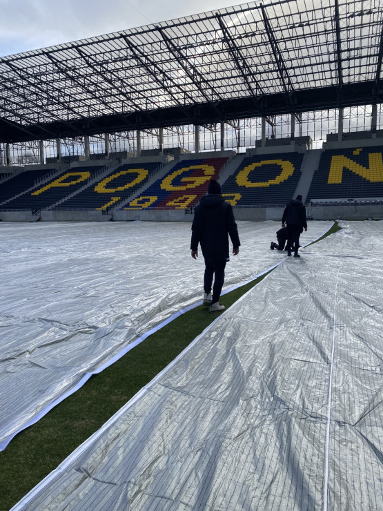 – Rozpoczęliśmy od ręcznego usunięcia z murawy topniejącego śniegu, żeby zminimalizować ryzyko pojawienia się pleśni śniegowej – tłumaczy Head Groundsman Pogoni Szczecin Jacek Dąbrowski.
