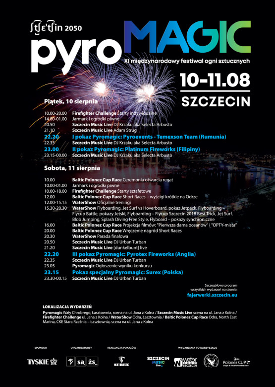 Szczeciński Pyromagic to widowisko, którego nie można przegapić! Nigdzie indziej w kraju nie zobaczymy tak efektownych pokazów w samym środku miasta i w tak niepowtarzalnej scenerii! W piątkowy i sobotni wieczór w niebo wystrzeli kilka ton masy pirotechnicznej. Pokazom towarzyszyć będzie muzyka. W tym roku choreografie będą tworzone do takich utworów jak: „Marsz Turecki” Wolfganga Amadeusza Mozarta, „Levels” Aviciiego, „Hey Mama” Davida Guetty czy „Thunderstruck” AC/DC.