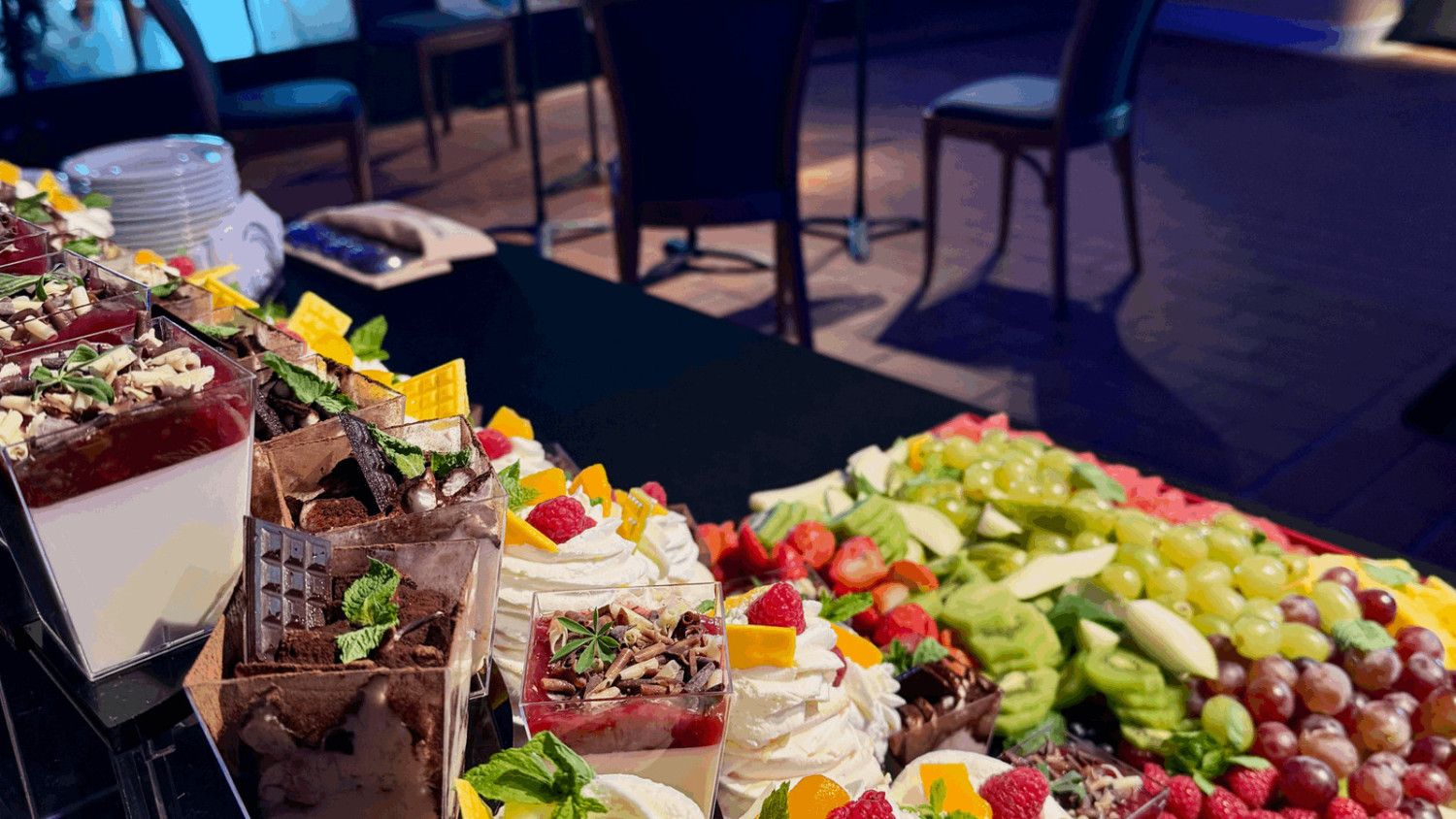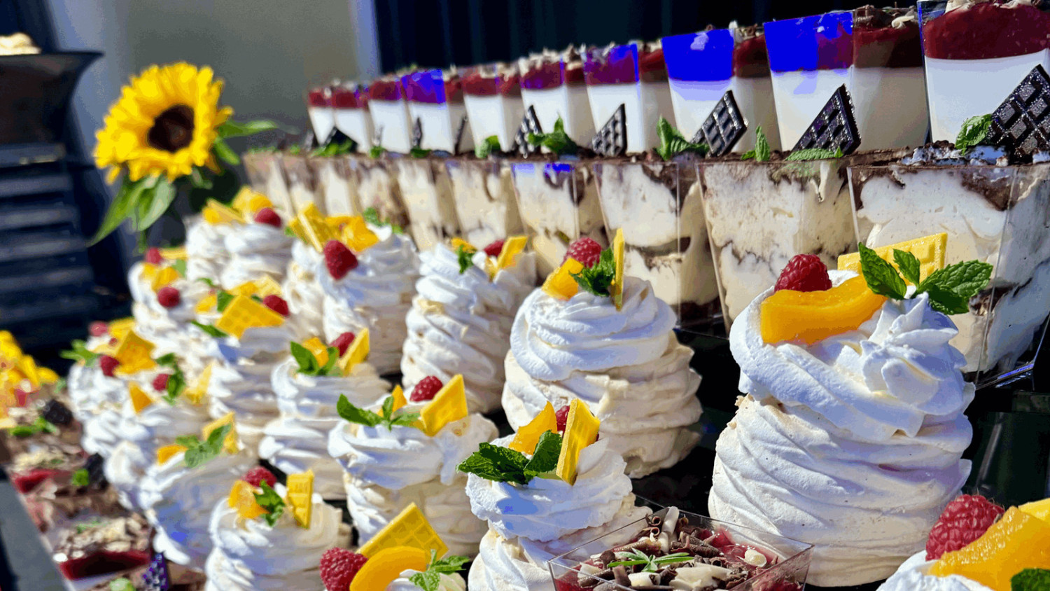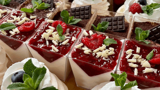 Goście mogą wybierać m.in. spośród takich propozycji jak tiramisu, panna cotta z sosem malinowym, mini deserki pistacjowe, brownie z kremowym serkiem truskawkowym i borówkami czy pudding orzechowo-bananowy z chia i owocami. Miłośnicy klasyki także znajdą coś dla siebie – np. klasyczną szarlotkę z bitą śmietaną. Desery są przygotowywane w formie eleganckich monoporcji, które świetnie prezentują się na stołach i podkreślają charakter wydarzenia.