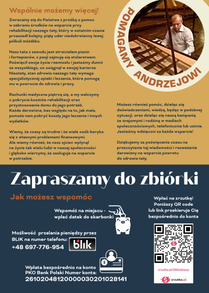 Pana Andrzeja można wesprzeć poprzez wpłaty bezpośrednie na konto PKO Bank Polski, numer konta: 26102048120000030201028141