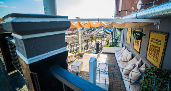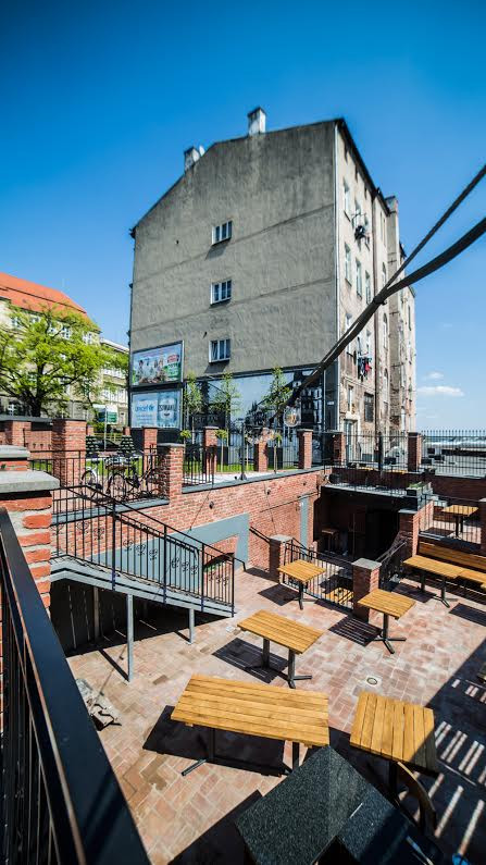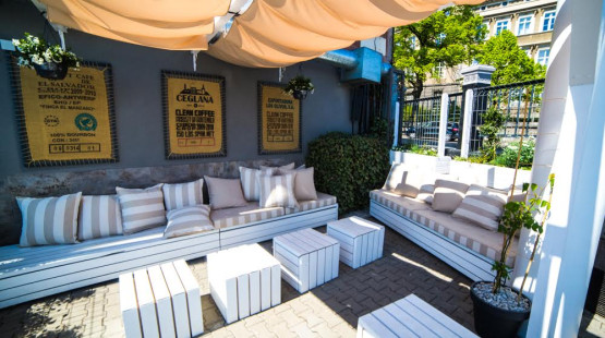 Przy obu wejściach są też ogródki. Jeden sąsiaduje ze schodami i rozpościera się z niego widok na perony. Drugi, kilkukrotnie większy i zlokalizowany na czterech poziomach mieści się przy wejściu od ul. Owocowej. Latem zostanie uruchomiony w nim zewnętrzny bar, a na zielonej trawie przy ścianie z grafiką przedstawiającą przedwojenny Szczecin pojawią się jeszcze leżaki i pufy.