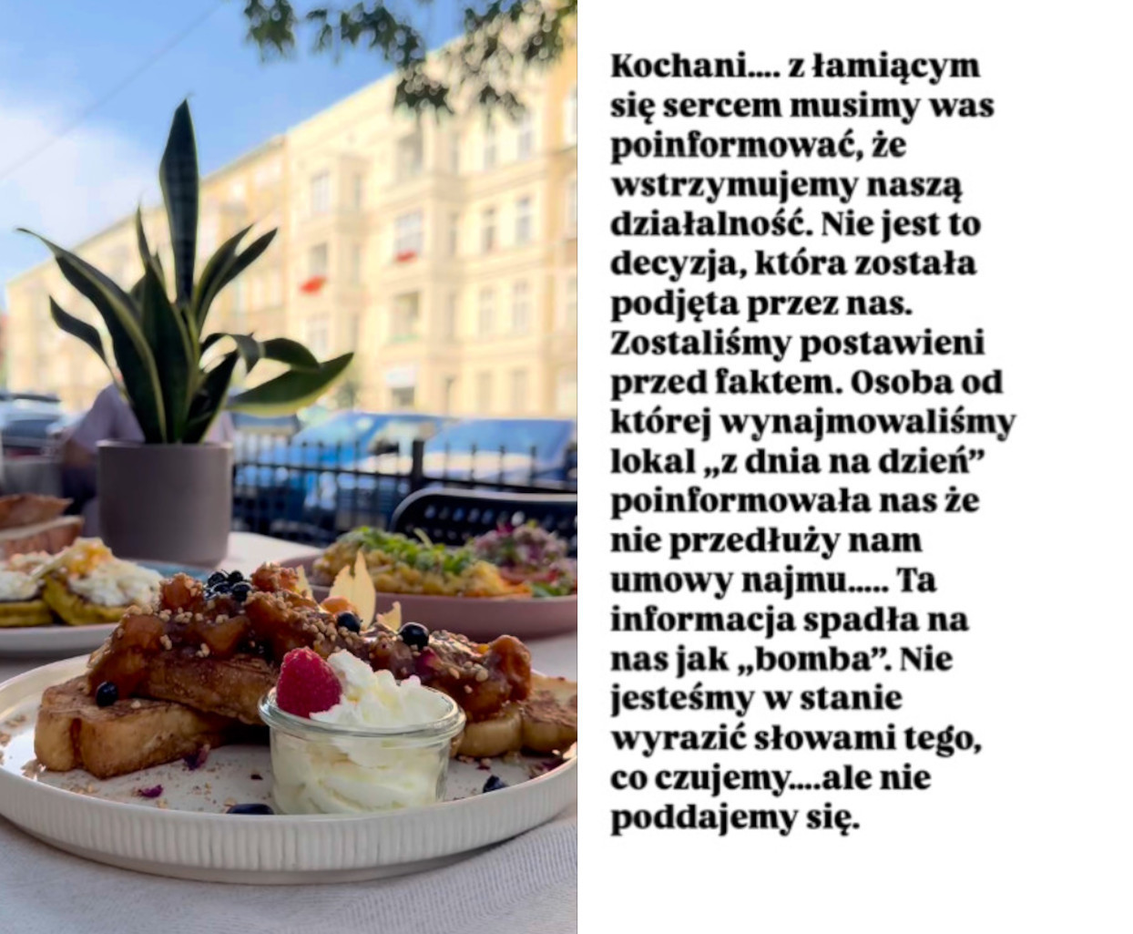 Sytuacja lokalu Kisiel jest jednak nieco inna. Śniadaniownia radziła sobie na rynku bardzo dobrze, a zawieszenie działalności spowodowane jest niespodziewanym wypowiedzeniem umowy najmu przez właściciela nieruchomości przy ul. Monte Cassino.