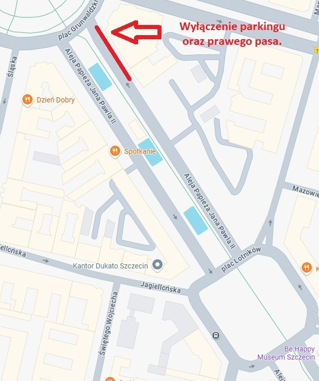 Początkowo przebudowa miała ruszyć od strony pl. Lotników, ale ostatecznie wygrodzono część miejsc parkingowych i prawego pasa tuż przed pl. Grunwaldzkim.
